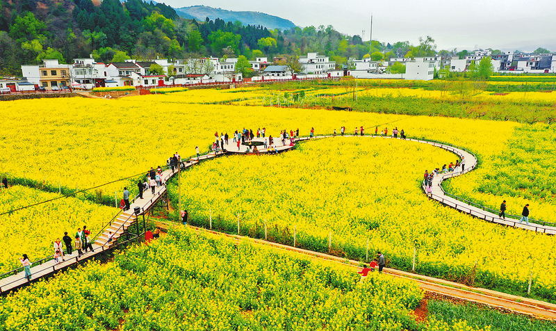 4月5日,正值清明小長假。丹鳳縣商鎮(zhèn)王塬村的300多畝油菜花恣意綻放,與蔚藍的天空、碧綠的青山、和美的村居相互映襯,構(gòu)成了一幅醉人的春日山水田園畫。觀賞長廊上,處處是前來賞花的游客,他們穿梭于金黃色的花海中“打卡”拍照,盡享美好春光。對于當(dāng)?shù)卮迕駚碇v,家門口的好風(fēng)景更帶來了好“錢”景。