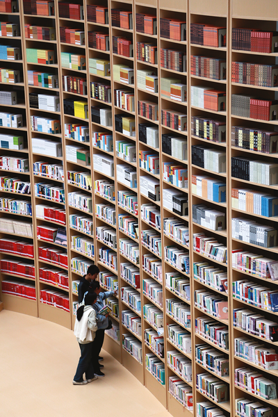 在洛南縣圖書館,書簡形狀的文化書墻別具一格。