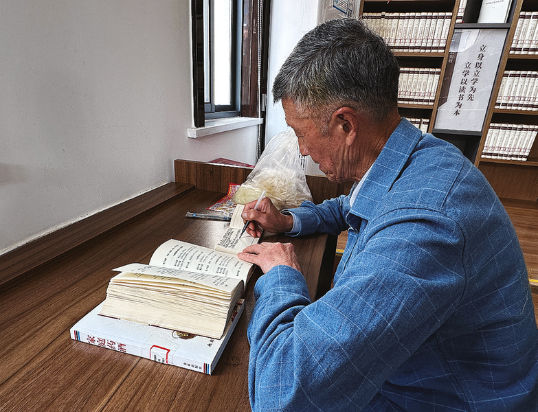 活到老,學到老。在市圖書館借閱區(qū),一名老人正在寫讀后感。