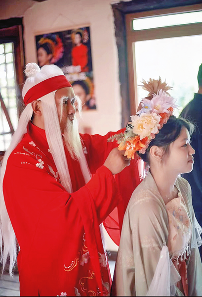 他的想法獲得了眾多顧客的認(rèn)可,前來(lái)體驗(yàn)的游客中,特別是情侶,大都會(huì)選擇讓“月老”為他們牽上紅線(xiàn),坐在大紅花轎中拍照留念。