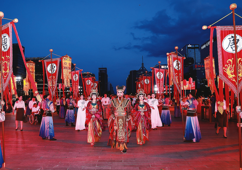 入城儀式上,“鴻臚寺卿”帶領(lǐng)“官兵”“侍女”盛裝出城,擺開迎賓陣列,與會(huì)人員踏著“千年之路”徐徐前行,登上歷經(jīng)千年歷史滄桑的古城墻。