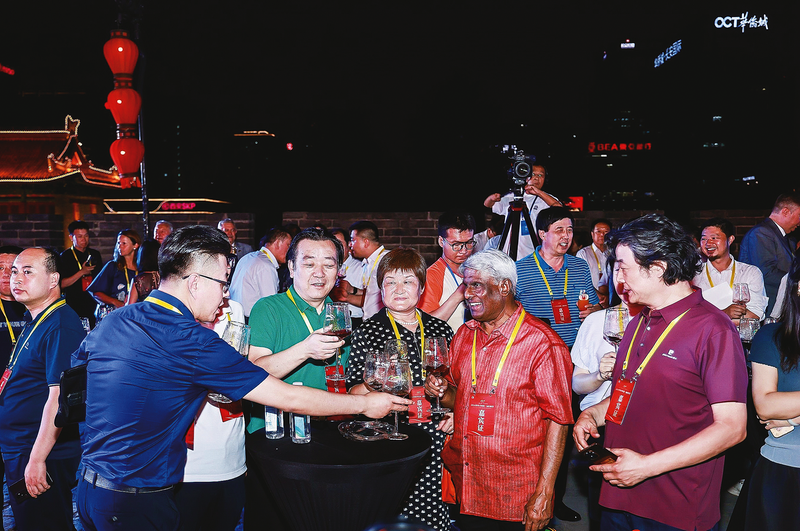 國內(nèi)外賓朋在古城墻上品鑒丹鳳葡萄酒