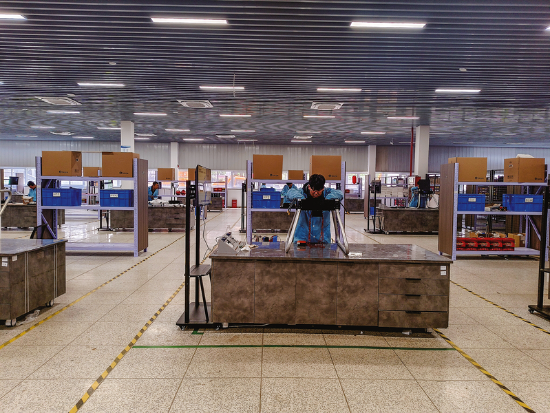 國飛領翼科技有限公司工作人員在生產(chǎn)廠房組裝無人機