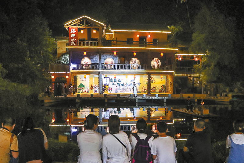 ?5月1日晚,柞水縣終南山寨熱鬧的夜市上,游客沉浸式欣賞表演。