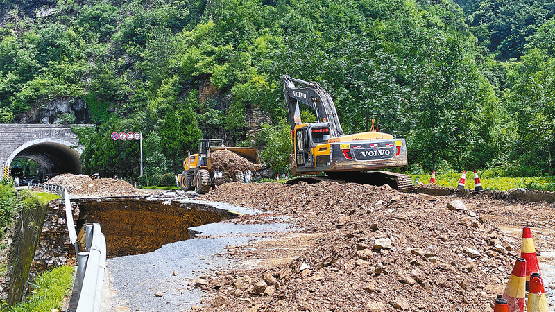 7月21日,在G242國(guó)道商山段小河灣附近,受近期降水影響,該路段損毀嚴(yán)重,現(xiàn)場(chǎng)施工人員在全力搶修道路,確保滯留旅客和車輛盡快及時(shí)轉(zhuǎn)運(yùn)。(本報(bào)記者 王江波 攝)
