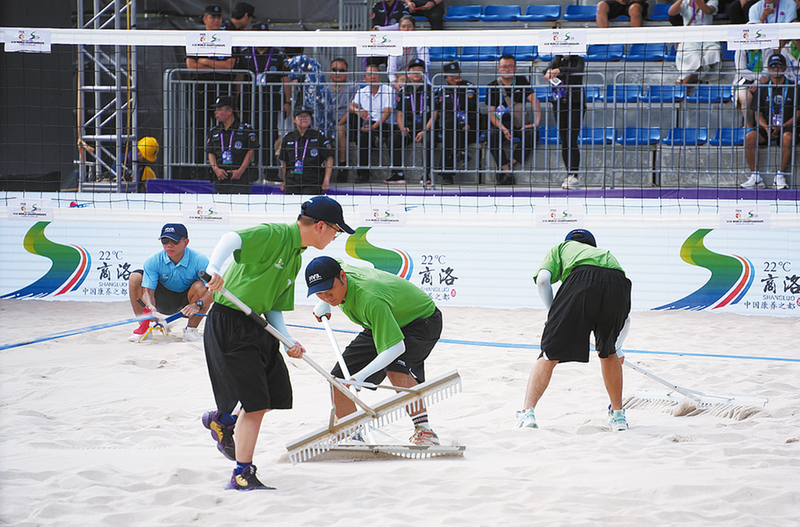 比賽間隙,耙沙志愿者迅速平整場(chǎng)地,保障比賽順利進(jìn)行。(本報(bào)記者 米子揚(yáng) 攝)