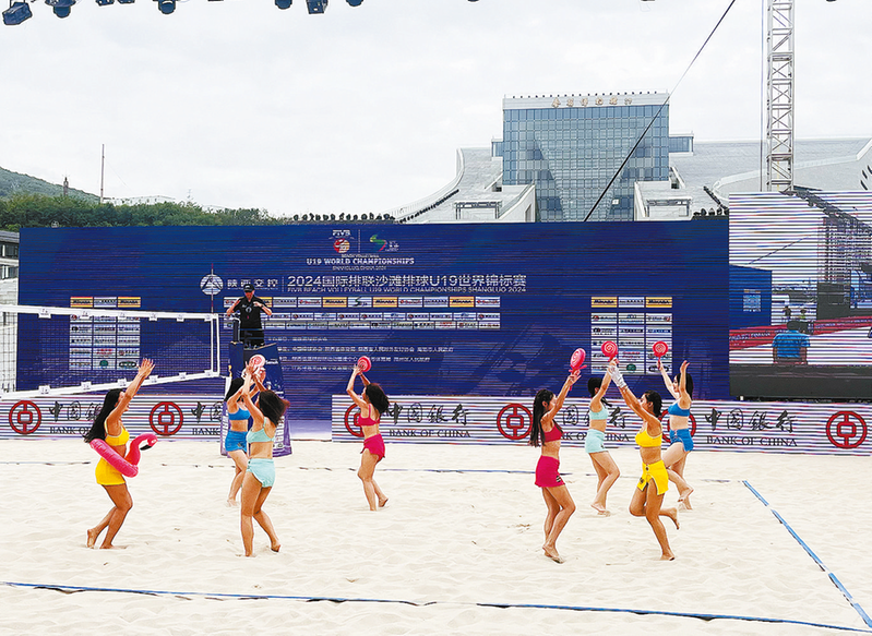 比賽間隙,沙排寶貝上演動(dòng)感熱舞。 (本報(bào)記者 張 英 攝)