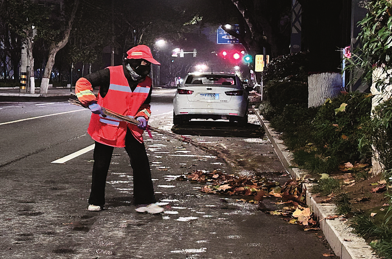 路燈下,雪花在雨中飄落下來,伴著寒冷而來,被水浸泡過的落葉吸附在濕漉漉的街道上,與環(huán)衛(wèi)工人手中的掃帚斗智斗勇。王小霞和她的同伴們分工明確,前面幾個(gè)人先把路上的落葉掃到一起,聚成一個(gè)個(gè)小堆,后面的搭檔拿著掃帚和簸箕,挨個(gè)將這些小堆垃圾鏟起來,倒進(jìn)電動(dòng)三輪垃圾車?yán)?,繼而騎著車慢慢追趕前面的清掃隊(duì)伍。