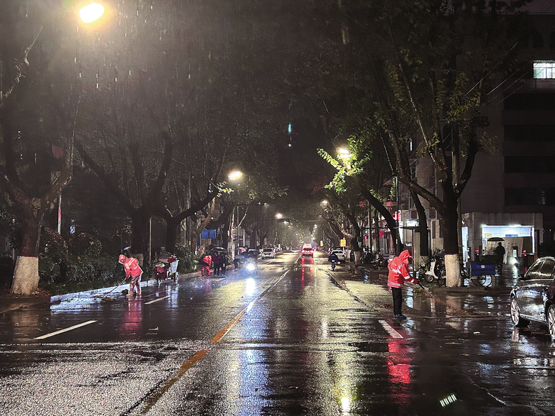 “被水浸泡過的落葉、垃圾和地面貼得更緊,清掃比較困難,攬起來的時(shí)候也是拖泥帶水的。”王小霞說,她負(fù)責(zé)早班的清掃工作,一般情況下,早上七點(diǎn)前,大面積早清掃就結(jié)束了。
