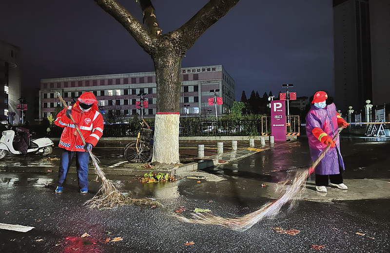 11月18日清晨6點(diǎn)31分,城北環(huán)衛(wèi)所西片四組環(huán)衛(wèi)工人王小霞和梁玉珍在市婦幼保健院門前清理路面垃圾。