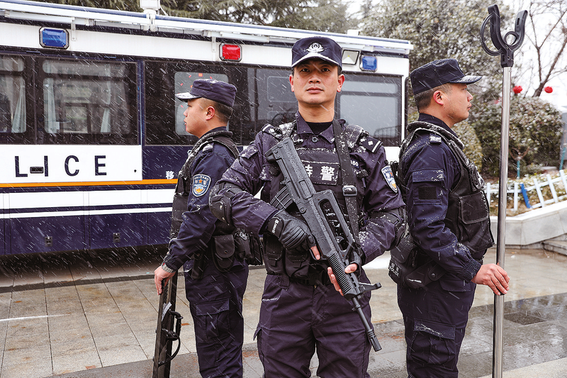 2024年春節(jié)期間,商洛公安啟動高等級勤務(wù)模式,切實提高見警率、管事率和震懾力。圖為2月21日,市公安局巡特警支隊執(zhí)勤民警在商州區(qū)萬達廣場屯警點執(zhí)行武裝聯(lián)勤聯(lián)防巡邏任務(wù)。 (本報通訊員 王 丹 攝)
