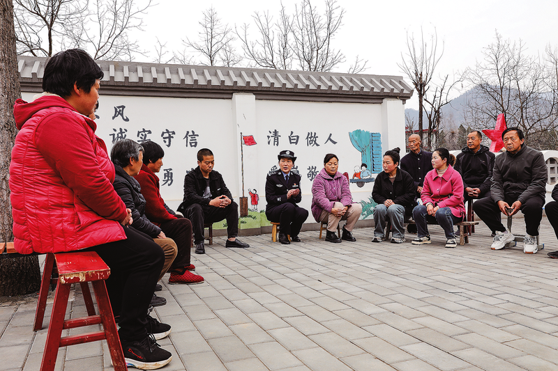 2024年5月20日,洛南縣公安局古城派出所所長王振全(右一)帶領(lǐng)社區(qū)民警深入轄區(qū)何村,開展主動警務(wù)工作,向正在田間勞作的群眾宣講反詐知識,講解識別電信詐騙的方法。 (本報通訊員 李重立 攝)