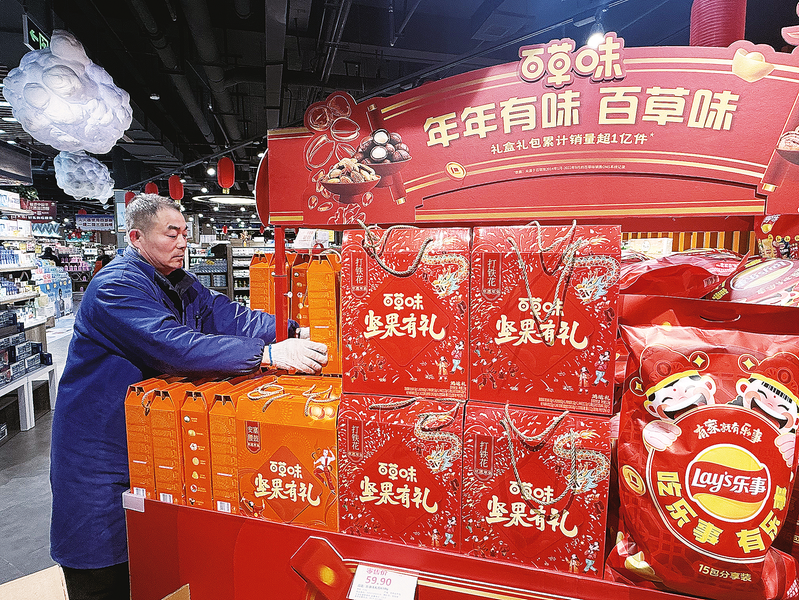 好樂購超市的工作人員在擺放節(jié)日禮盒