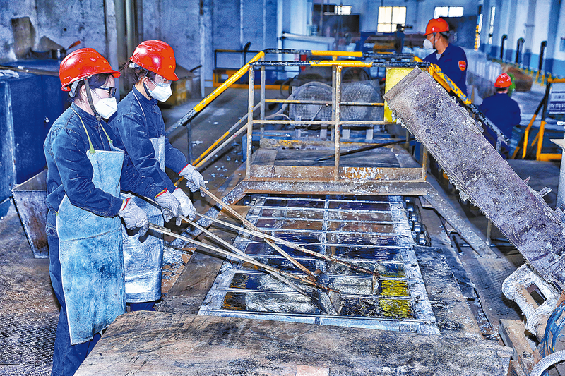 面對400℃高溫,女職工淡定地完成鋅錠表面預(yù)處理工作。
