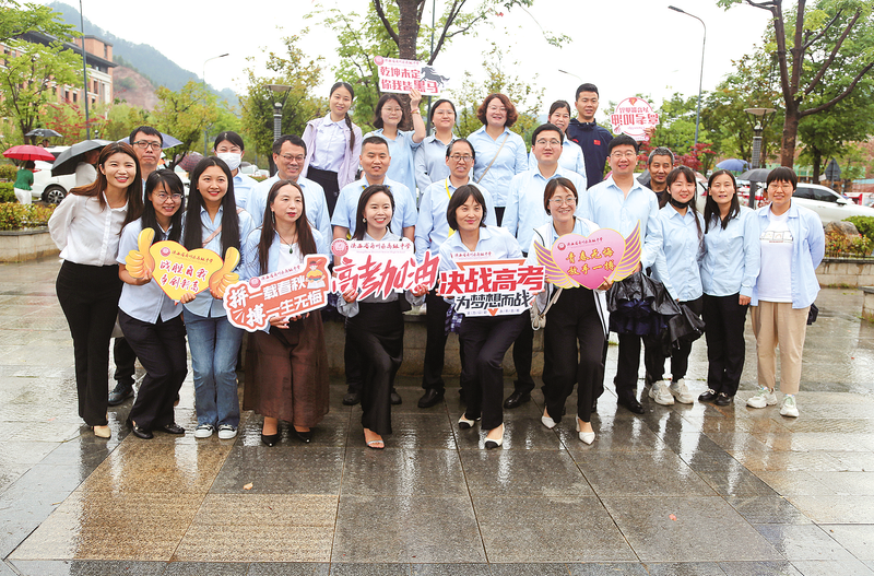 6月7日,商州區(qū)高級中學28名教師手舉勵志手牌,在考點入口道路旁為每位考生加油鼓勁。