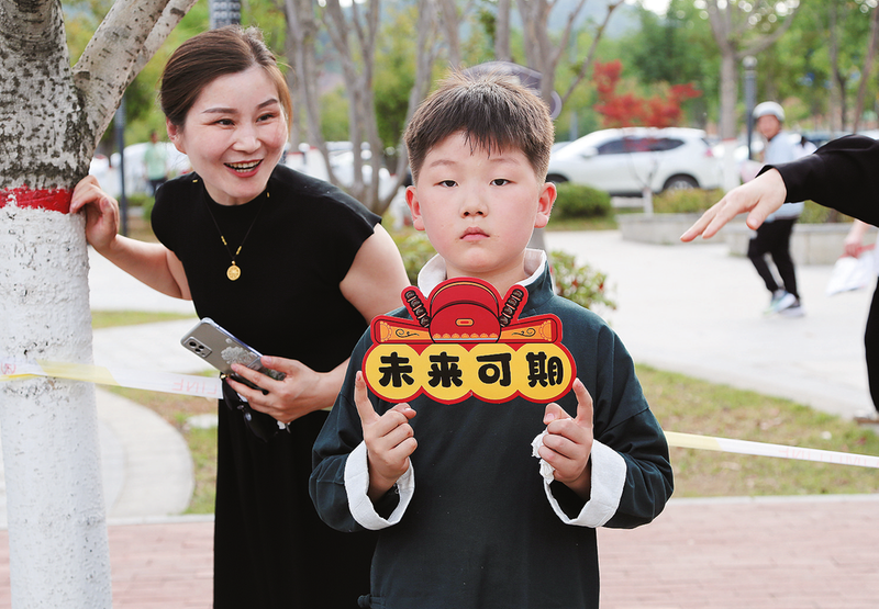 6月8日,商洛中學考點處一位小朋友為姐姐送上特別的祝福。