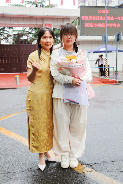 ?6月7日,考生家長劉煜婷身著金黃色旗袍,手捧鮮花接女兒走出考場。