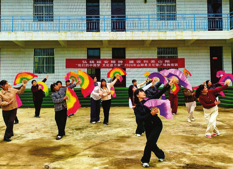 △近日,山陽(yáng)縣文化館先后在十里鋪街道高二社區(qū)、城關(guān)街道張?jiān)鐓^(qū)等地開展“弘揚(yáng)延安精神 建設(shè)和美山陽(yáng)——我們的中國(guó)夢(mèng) 文化進(jìn)萬(wàn)家”廣場(chǎng)舞培訓(xùn)。山陽(yáng)縣文化館選派專業(yè)人員精心為基層舞蹈愛好者進(jìn)行教學(xué)指導(dǎo),以文藝培訓(xùn)傳承延安精神、豐富群眾文化生活。圖為文化館舞蹈培訓(xùn)老師正在高二社區(qū)開展《東方紅》扇子舞培訓(xùn)。(本報(bào)通訊員 王榮金 攝)