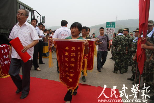 聽說官兵們要走了,受災村民特意制作了錦旗以表謝意。 圖片來源:人民武警報