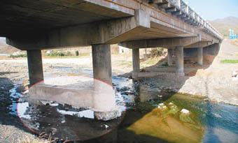 近日,商南縣部分群眾致電本報(bào),稱312國(guó)道黑漆河大橋下的橋柱被河水沖得懸空。11月12日上午,記者趕到現(xiàn)場(chǎng)后看到,大橋下并排有3組共6根水泥柱子,其中靠大橋西頭的兩根橋柱子基礎(chǔ)周圍已經(jīng)沒(méi)有任何泥土遮擋,水泥柱子已經(jīng)裸露在外(如圖),連接并排柱子的水泥底座也已徹底懸空。當(dāng)?shù)卮迕窭咸锔嬖V記者,312國(guó)道的車流量非常大,這座大橋一旦出現(xiàn)意外,后果將不堪設(shè)想。當(dāng)?shù)卮迕裰v,導(dǎo)致此情況的原因可能是河水長(zhǎng)期沖刷加之今年夏季的洪水造成的。據(jù)了解,黑漆河大橋建于1998年6月,長(zhǎng)約80米,是312國(guó)道商南縣境內(nèi)一座較大的橋梁。
