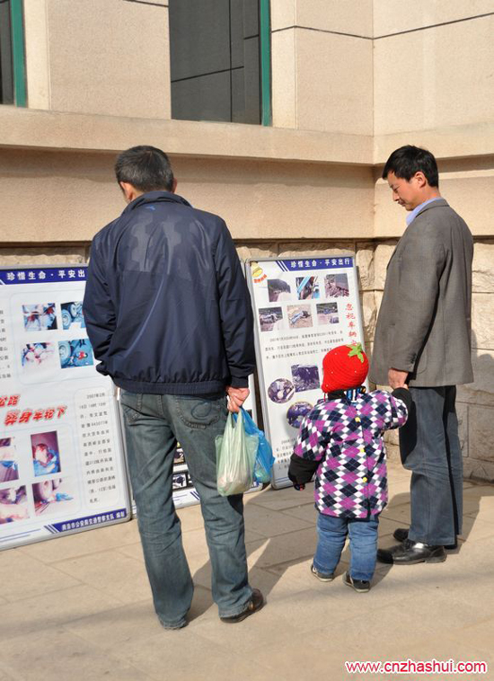 年輕的父親帶著孩子來看普法展板