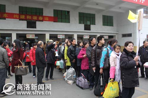 今天(2月9日)上午,記者在商洛市客運中心候車室看到,候車廳等車的人群排著長長的隊,一直延伸到上車的地方,車站工作人員拿著擴音器維持現(xiàn)場秩序。