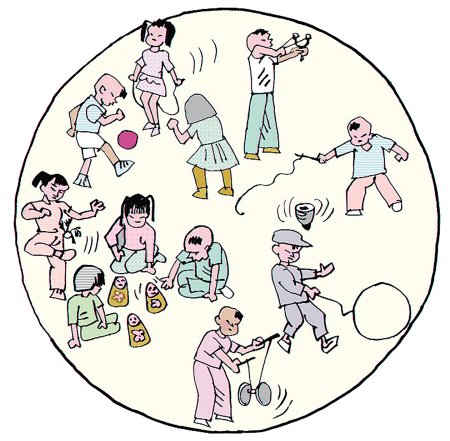 這一階段,兒童游戲按類別可分為以下幾種,球毽類如:足球、手球、彩球、繡球、拍皮球、踢毽子等。投擲類有:彈弓、射箭、抓子兒等。冰水類:打水仗、堆雪人、滑冰車、打陀螺等。生活游戲類:過家家、演劇唱戲、養(yǎng)貓養(yǎng)狗養(yǎng)小雞、捕蟬捕鳥撲蝴蝶、養(yǎng)蟈蟈養(yǎng)蟋蟀。休閑運(yùn)動類:抖空竹、放風(fēng)箏、捉迷藏、打秋千、滾鐵環(huán)、跳大繩、跳皮筋等。