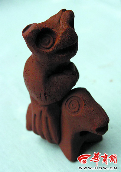 在商洛市中心以東2.5公里的丹江北岸,有個村子叫東龍山,村里的小娃們都會唱一首歌謠:“東龍山,拐個彎,龍山雙塔戳上天,龍梁上面高架板,男女老少坐一灘,狗娃咪,吹得歡……”“狗娃”是指泥捏成的玩具像小狗,而“咪”在當?shù)胤窖岳锸巧谧印?/p>