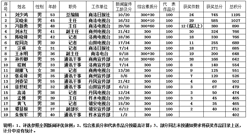商洛市2012年省市優(yōu)秀新聞工作者評(píng)選工作,于今2月12日開(kāi)始,首批按時(shí)按要求上報(bào)的14位侯選人參加了省優(yōu)秀新聞工作者聯(lián)評(píng),劉少鴻同志以1195分位居第一,成為我市報(bào)送省優(yōu)秀新聞工作者人選,3月30日已報(bào)省記協(xié),省評(píng)工作正在進(jìn)行。之后,第二批參評(píng)市優(yōu)秀新聞工作者人選上報(bào)。近日,經(jīng)初評(píng)以下19名同志為2012年商洛市優(yōu)秀新聞宣傳工作者。定評(píng)會(huì)將于6月舉行,記者節(jié)進(jìn)行表彰。