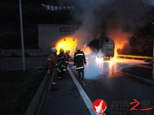昨天晚上7時50分許,3輛消防車鳴著警笛從商洛市區(qū)工農路呼嘯向南疾馳而去。“不好,高速公路金嶺隧道口一輛液化氣罐車著火了!危險的很!”記者聞訊隨即趕赴現(xiàn)場。