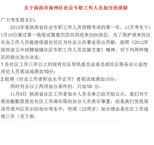 據(jù)了解,2012年11月12日,有網(wǎng)友發(fā)表了一則關(guān)于質(zhì)疑陜西省商洛市商州區(qū)社會專職工作人員加分的帖子。