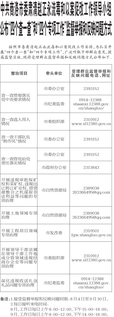 中共商洛市委肅清趙正永流毒和以案促改工作領(lǐng)導(dǎo)小組公布“四個(gè)查一查”和“四個(gè)專(zhuān)項(xiàng)工作”監(jiān)督舉報(bào)和反映問(wèn)題方式