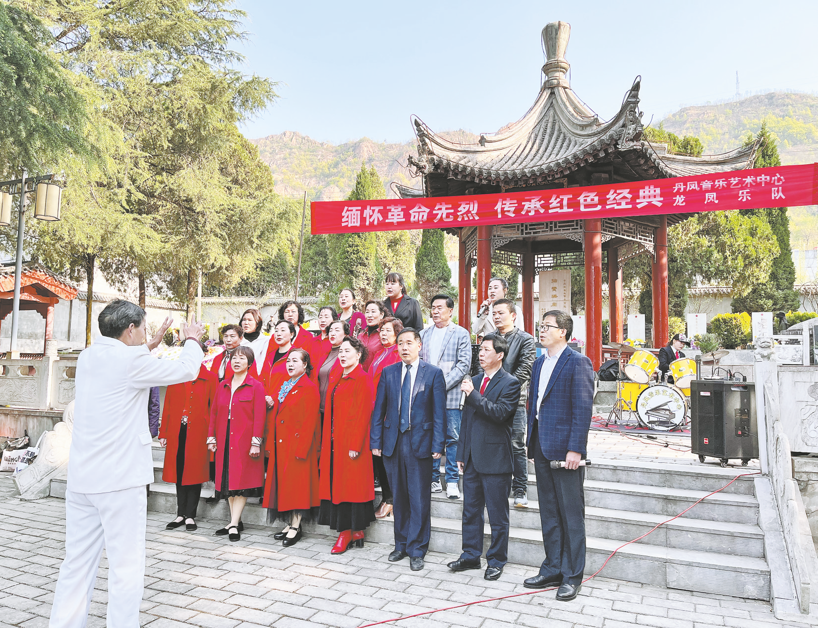 4月5日,丹鳳縣音樂藝術(shù)中心龍鳳樂隊(duì)的成員們?cè)诳h烈士陵園舉辦“緬懷革命先烈,傳承紅色經(jīng)典”活動(dòng),用一首首耳熟能詳?shù)母枨拺严攘?,激?lì)后輩發(fā)揚(yáng)紅色傳統(tǒng)。 (本報(bào)記者 謝非 攝)
