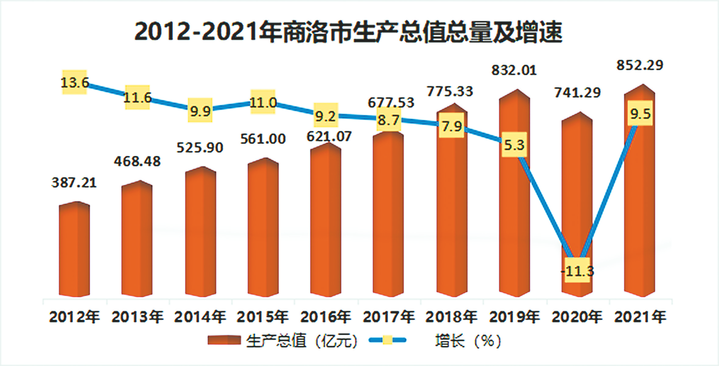 經(jīng)濟總量持續(xù)增長。黨的十八大以來,我市經(jīng)濟總量相繼邁上了一個又一個新臺階,實現(xiàn)了突破式發(fā)展。2012年,我市經(jīng)濟總量為387.21億元,一二三產(chǎn)實現(xiàn)增加值分別為77.7億元、150.81億元、158.63億元;2021年,商洛經(jīng)濟總量達到852.29億元,是2012年的2.2倍,一二三產(chǎn)實現(xiàn)增加值分別118.50億元、339.77億元、394.02億元,分別是2012年的1.5倍、2.3倍、2.5倍。