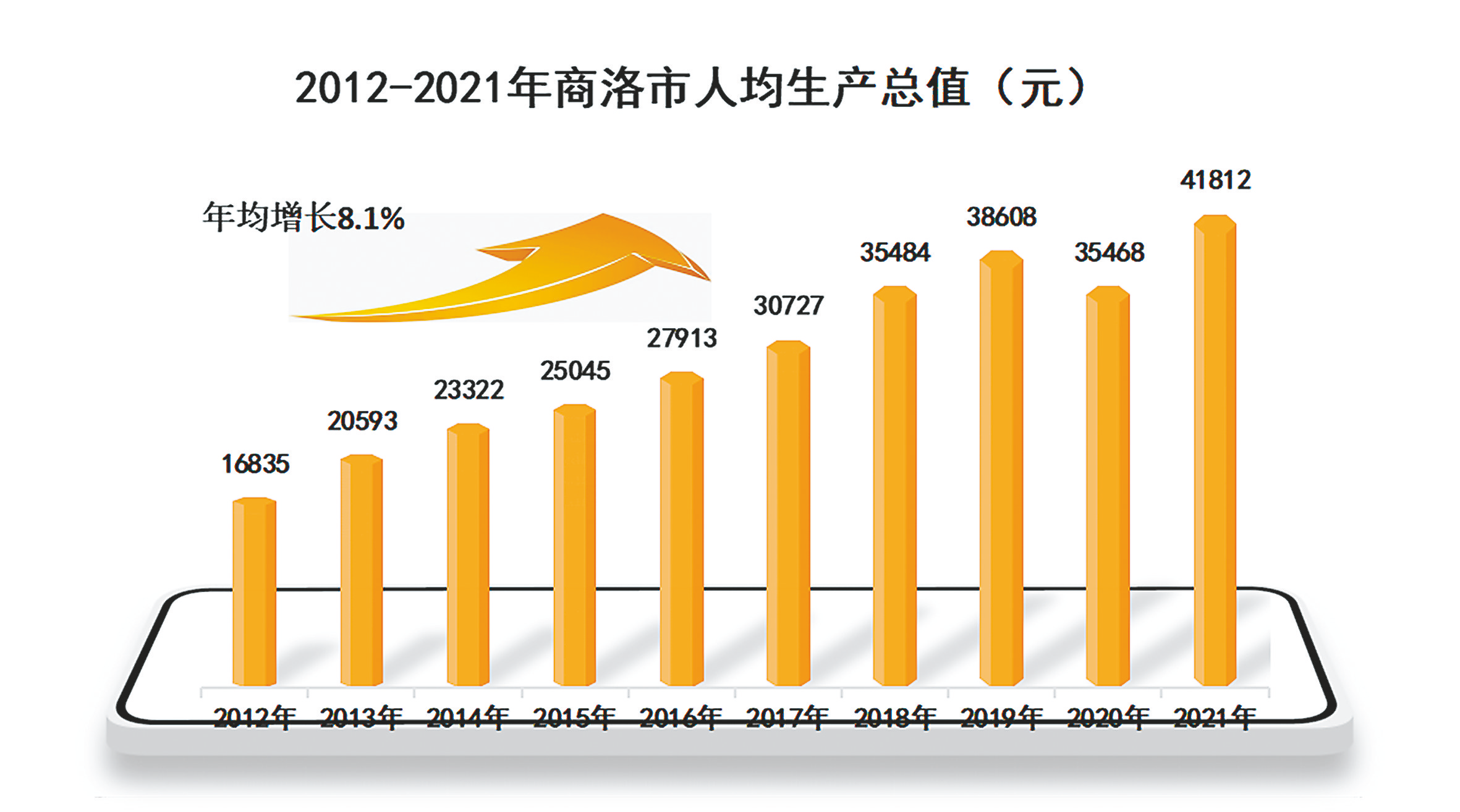 人均GDP達到新水平。隨著我市經(jīng)濟總量的不斷擴大,人均生產(chǎn)總值也持續(xù)增加,為推動高質(zhì)量發(fā)展奠定了良好的宏觀經(jīng)濟基礎(chǔ)。2012年我市人均GDP為16835元,2021年突破歷史新高,達到41812元,比2012年增加24977元,是2012年的2.5倍,年均增長8.1%,比全省平均水平高1.4個百分點。