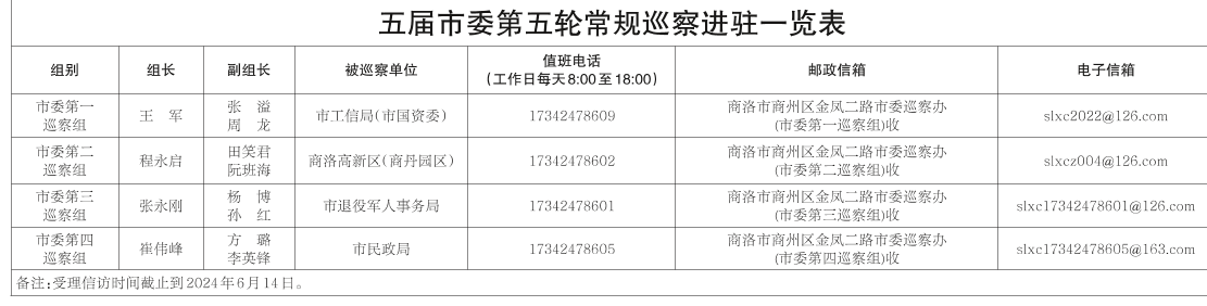 經(jīng)市委批準(zhǔn),2024年5月21日至6月19日,市委派出4個(gè)巡察組,對(duì)市工信局(市國資委)、商洛高新區(qū)(商丹園區(qū))、市退役軍人事務(wù)局、市民政局共4個(gè)部門(單位)黨組織開展常規(guī)巡察。