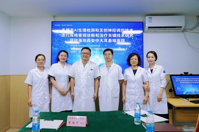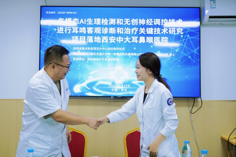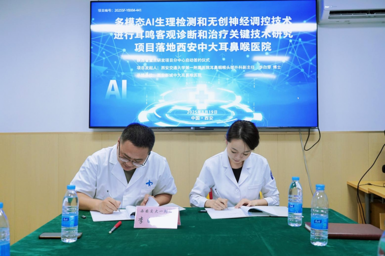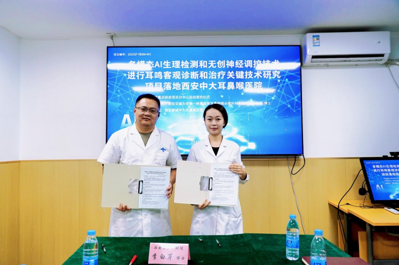 西安交通大學(xué)第一附屬醫(yī)院耳鼻咽喉頭頸外科副主任李白芽博士與西安新城中大耳鼻喉醫(yī)院院長(zhǎng)助理王瑩主任共同簽署了《多模態(tài) AI 生理檢測(cè)和無(wú)創(chuàng)神經(jīng)調(diào)控技術(shù)進(jìn)行耳鳴客觀診斷和治療關(guān)鍵技術(shù)研究項(xiàng)目聯(lián)合研究協(xié)議書(shū)》(項(xiàng)目編號(hào):2025SF-YBXM-441)。