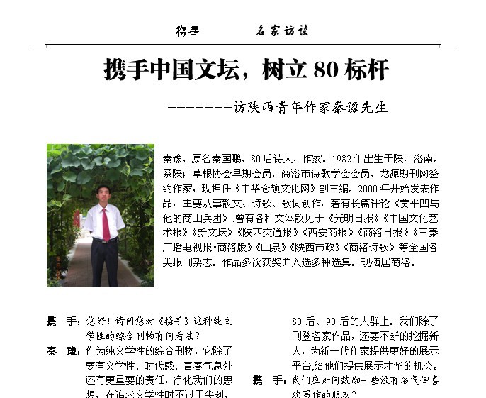 9月11日,商洛市詩歌學(xué)會(huì)會(huì)員、陜西草根協(xié)會(huì)早期會(huì)員、新生代80后作家、中華倉(cāng)頡文化網(wǎng)副主編秦豫(秦國(guó)鵬)先生應(yīng)邀做客《攜手》名家專訪?!稊y手》雜志主編,攜手青年作家協(xié)會(huì)主席海鵬先生擔(dān)任了本次專訪的總顧問。先將采訪現(xiàn)場(chǎng)實(shí)錄于下,敬請(qǐng)關(guān)注,以饗讀者。