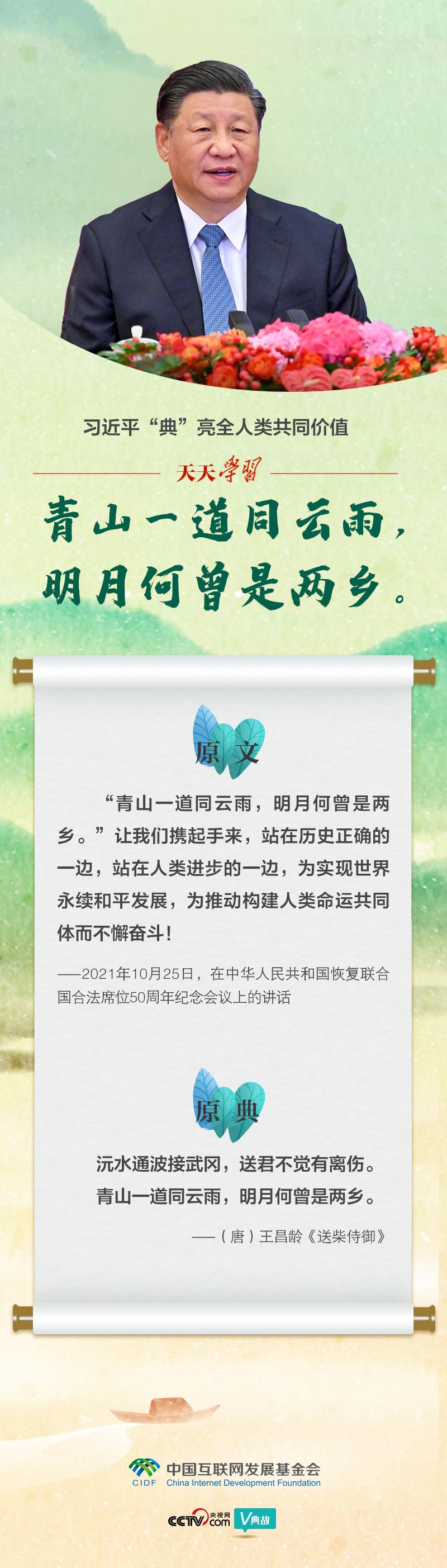 大道不孤,天下一家。2021年10月25日,在中華人民共和國(guó)恢復(fù)聯(lián)合國(guó)合法席位50周年紀(jì)念會(huì)議上,習(xí)近平主席借此詩(shī)句暢談構(gòu)建人類(lèi)命運(yùn)共同體。他說(shuō):“我們應(yīng)該攜手推動(dòng)構(gòu)建人類(lèi)命運(yùn)共同體,共同建設(shè)持久和平、普遍安全、共同繁榮、開(kāi)放包容、清潔美麗的世界。”