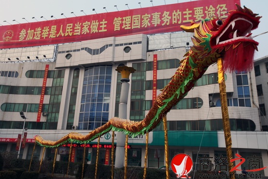 市中心廣場,在“參加選舉是人民當(dāng)家做主、管理國家事務(wù)的主要途徑”的巨幅標(biāo)語下,一條騰飛的巨龍象征著我市龍年再創(chuàng)輝煌。(方 立 攝)