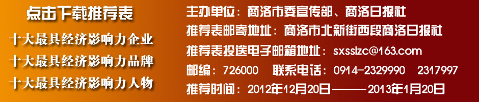 為全面、系統(tǒng)地反映我市各縣區(qū)2012年度經(jīng)濟(jì)亮點(diǎn)和經(jīng)濟(jì)界突出人物及創(chuàng)新型企業(yè)風(fēng)采,經(jīng)市委領(lǐng)導(dǎo)同意,由市委宣傳部、商洛日?qǐng)?bào)社共同主辦第二屆經(jīng)濟(jì)影響力評(píng)選活動(dòng)。