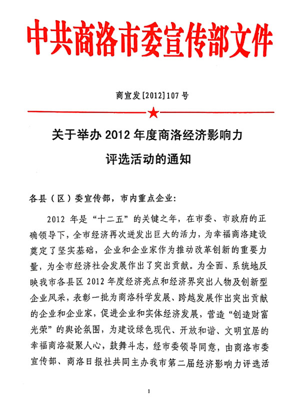 關(guān)于舉辦2012年度商洛經(jīng)濟(jì)影響力評(píng)選活動(dòng)的通知