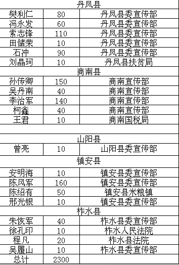 掌中商洛訊 掌中商洛自6月底上線以來,得到社會各界的廣泛關(guān)注,特別是得到廣大通訊員的大力支持。三個月來,共收到社會來稿300余篇,其中從中選用編發(fā)稿件230篇?,F(xiàn)將編發(fā)的稿件作者姓名、單位,發(fā)稿篇數(shù)等情況予以公布。請市直部門自公布之日起,本人持有效證件到商洛日報社辦公樓503號領(lǐng)取。七縣區(qū)的稿費,由各縣區(qū)宣傳部指定人員來報社新媒體部代領(lǐng),再按相關(guān)人員分別發(fā)放。聯(lián)系電話:2395887。附用稿情況詳單:
