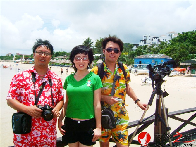 同陜西電視臺主持人燕子、攝像記者張晨沐浴海南亞龍灣的沙灘陽光。
