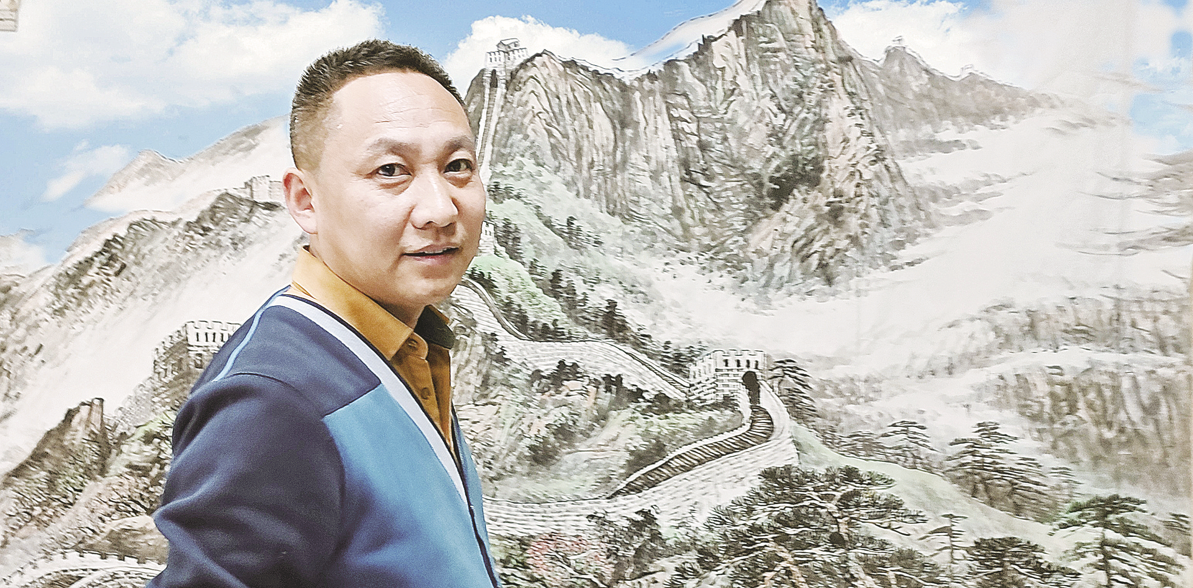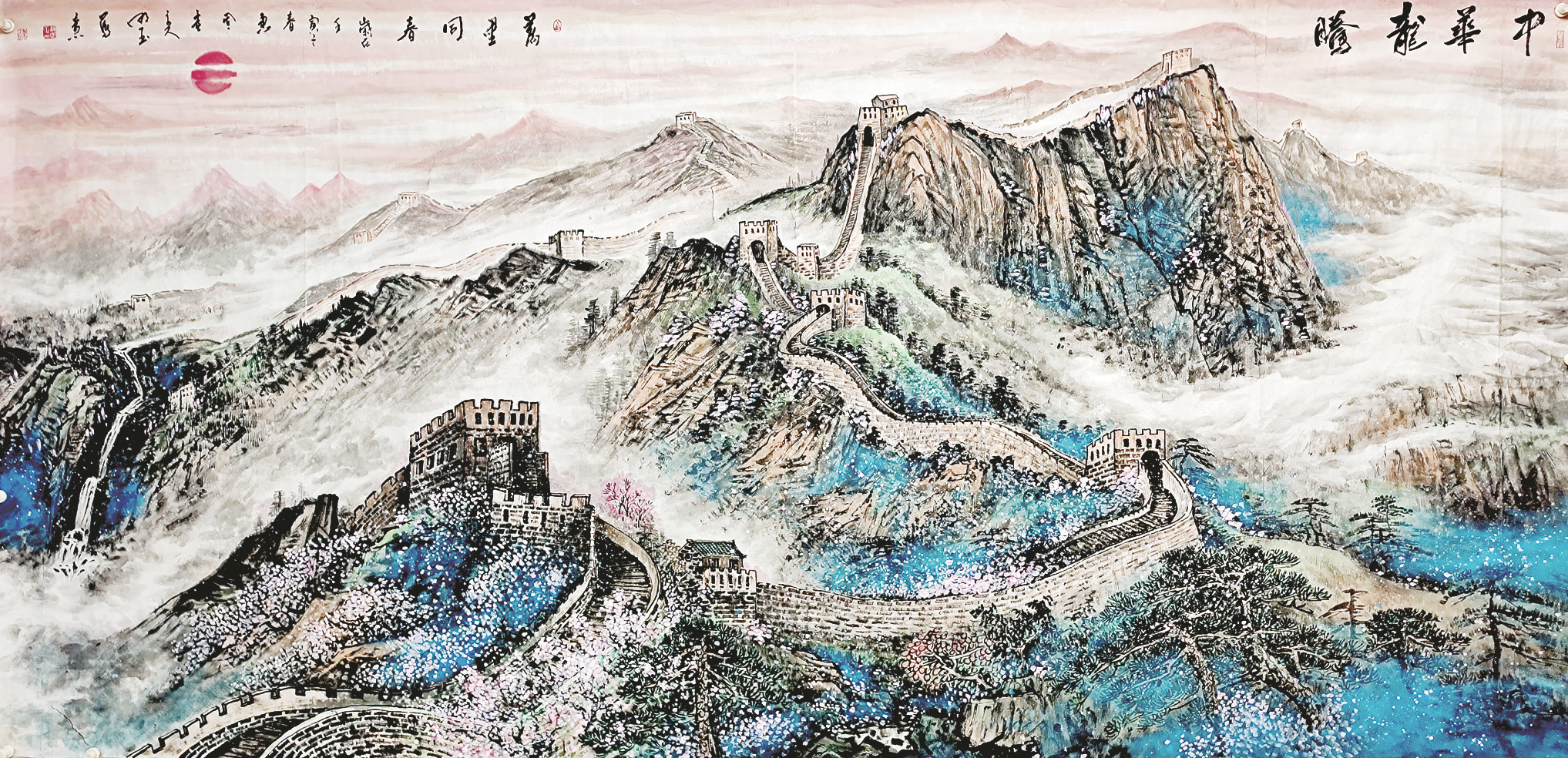 一幅丈二的山水畫卷在他的筆下徐徐鋪陳開來,蜿蜒于群山峻嶺中的長(zhǎng)城映入眼簾,高聳的烽火臺(tái)沒入遠(yuǎn)處的云霧里,忽隱忽現(xiàn),秦時(shí)的長(zhǎng)城如一條騰起的巨龍守護(hù)著祖國(guó)的壯麗河山。山勢(shì)陡峭,云霧繚繞,山林層巒疊翠,山下桃花盛開,不僅讓人想起毛主席的詩詞“望長(zhǎng)城內(nèi)外,惟余莽莽,大河上下,頓失滔滔”“雄關(guān)漫道真如鐵,而今邁步從頭越”的豪邁和激情。