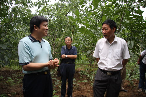 圖為西北農(nóng)林科技大學校長孫武學視察我市良種核桃豐產(chǎn)栽培技術推廣工作
