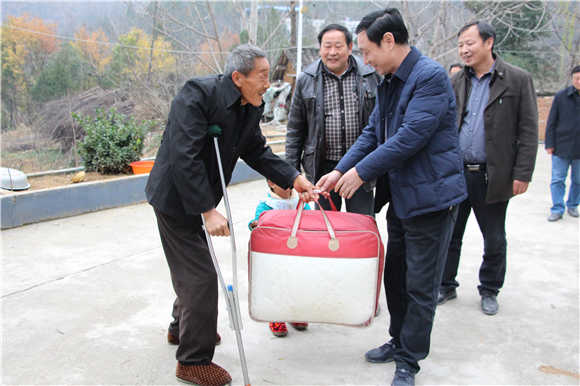 70多歲的貧困戶趙付恩,夾著雙拐一手提著市交通局領(lǐng)導送來的棉被,一手緊緊地拉著許局長的手,仿佛遇到了久別的親人,遲遲不肯放開,哽咽的表達著感激之情。