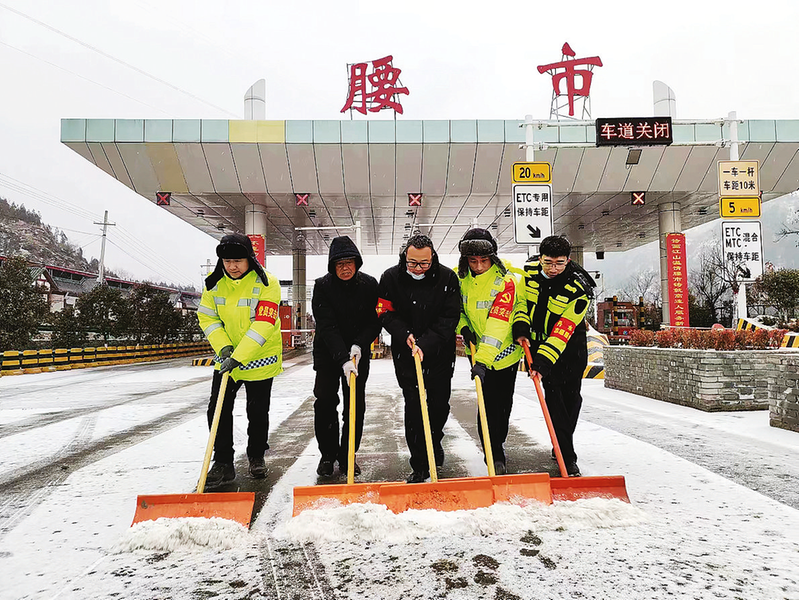 腰市收費(fèi)站工作人員對(duì)收費(fèi)通道進(jìn)行人工除雪
