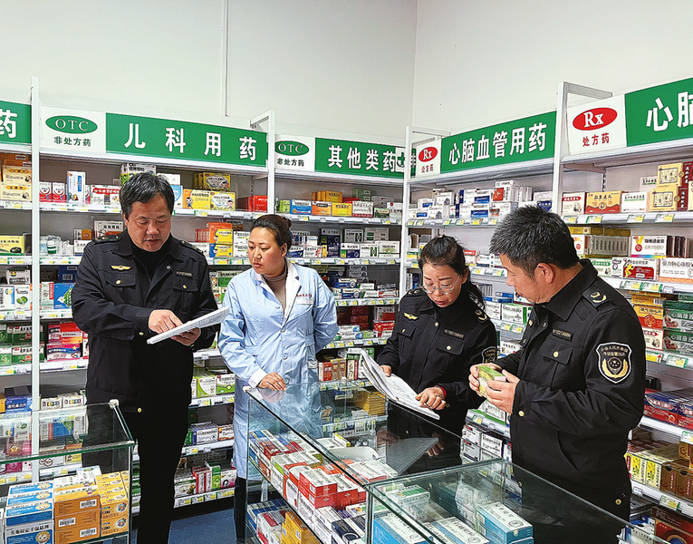 11月21日,市市場監(jiān)管局執(zhí)法人員在藥店檢查藥品質(zhì)量安全,查看記錄臺賬。