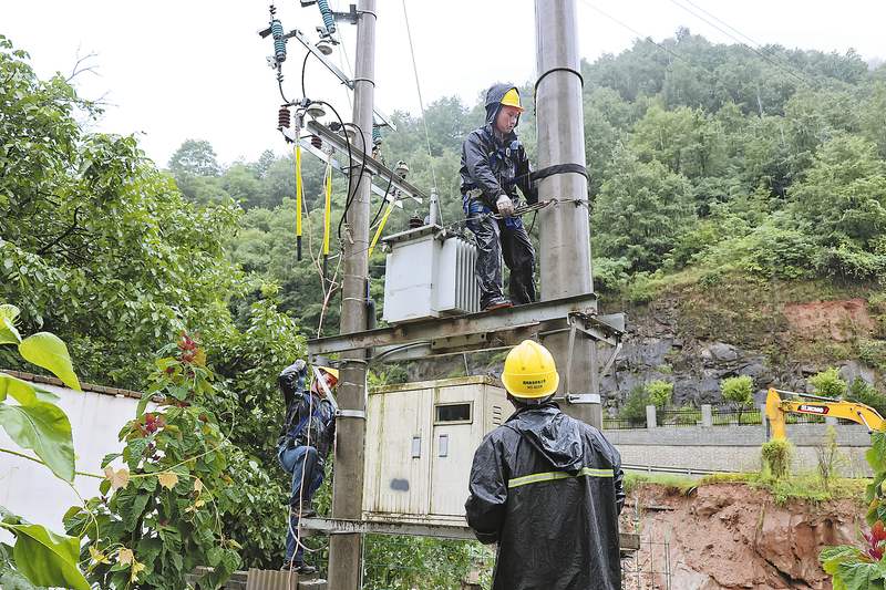 △國網(wǎng)商洛供電公司工作人員冒雨搶修受損電力設(shè)施